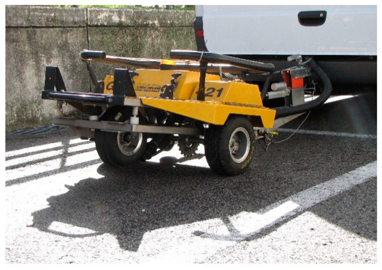 In this study, the wet skid resistance was measured with a Grip Tester, according to the technical standard CEN/TS 15901-7:2009 [2]. The device is a trailer with two drive wheels and a single small test wheel that was towed behind a vehicle (Figure 1). The test wheel is mounted on a stub axle and is mechanically braked by a fixed gear and chain system with a ratio of 27:32 in relation to the drive wheels so that there is a slip ratio of just over 15%. The static load on the test wheel is (50 ± 30) N. The test wheel tyre has a smooth tread. The two drive wheels are mounted on the main axle, which also carries a toothed wheel. Water is deposited in front of the test tyre from a water tank fitted with a control valve. To the trailer are coupled systems to continuously measure and store the distance and horizontal drag and vertical load forces. The friction coefficient, known as the Grip Number (GN), is calculated as the rate vertical/drag load forces. The test was carried out in wet conditions with the vehicle operating at 50 km/h.