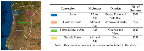 The data was collected in the highway network of the Portuguese concessionaire Ascendi on different roads with at least two traffic lanes in each direction, which are located in six districts: Aveiro, Braga, Guarda, Porto, Vila Real, and Viseu, as shown in Figure 2. Thus, they are inserted in different climate environments and topographic conditions, but they were constructed mostly with granite aggregates, as they are abundant in those regions.