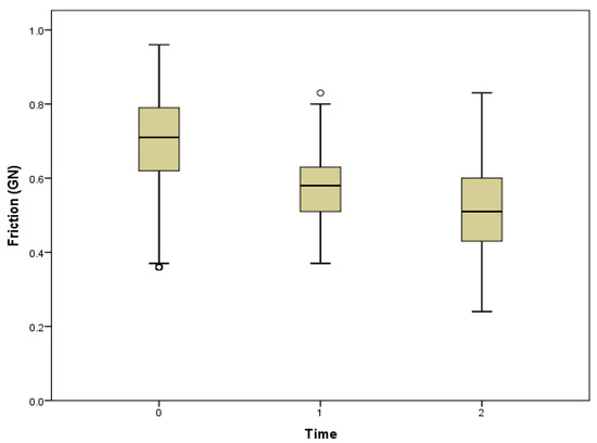 In this subsection, the descriptive analysis of the variables is presented. Firstly, a box plot illustrating how the dependent variable (friction) changed in time is presented in Figure 3. As can be seen, there is an apparent decrease in the median of the friction with time. To confirm that, a Kruskall–Wallis test was conducted. The test results showed statistically significant differences in the median of friction among the three times (p-value < 0.001). Furthermore, the friction of period 2 is statistically lower than the friction of periods 0 and 1 (Turkey’s HSD test, p-value < 0.001). This demonstrates that the parameter friction has a typical performance regarding the asphalt pavements.