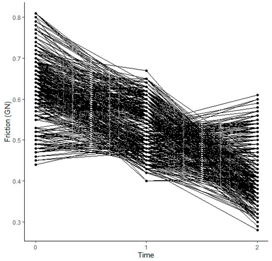 Following the same methodology described before, linear mixed models for three data levels were developed to describe the degradation of the friction parameter.