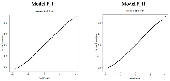 Normal quantile–quantile (Q-Q) plot of the standardized residuals from Models P_I and II.
