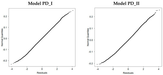Normal Q-Q plot of the standardized residuals from Models PD_I and II.