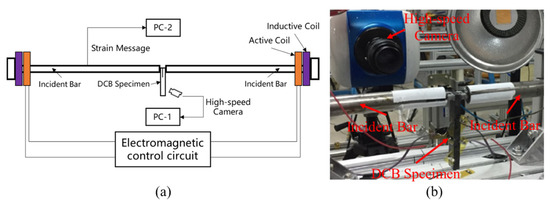 The simulation in this paper is based on the dynamic double cantilever beam (DCB) experiment in the literature [32]. The dynamic DCB test was carried out by an electromagnetic Hopkinson bar apparatus which can guarantee pure mode I loading, shown in Figure 1. The schematic diagram of the electromagnetic Hopkinson bar is shown in Figure 1a and the testing bench is shown in Figure 1b. As the Hopkinson bar is very long, only the testing bench near the DCB specimen is shown. The Hopkinson tension bar test system and the data acquisition system are contained in this experiment equipment. The Hopkinson tension bar test system contains the incident bars, active coils, inductive coils and electromagnetic control circuit. The active coils are connected with the electromagnetic control circuit. After the electromagnetic induction and interaction between active coil and inductive coil, the tension stress waves can be synchronously generated in the incident bars. Then, the specimen can be loaded symmetrically to get the pure mode I fracture.