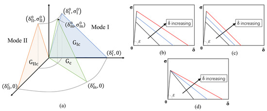 In mixed-mode facture, the coupling relationship between mode I and mode II facture is shown in Figure 2a. The quadratic stress failure criterion is adopted as the mixed-mode damage initiation criterion [21]: