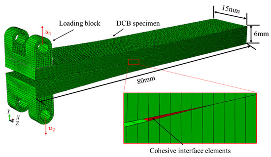 The finite element (FE) model was established in Abaqus® 6.14-1, shown in Figure 3. The FE model consists of loading block and DCB specimen. The size of the specimen is 80 mm × 15 mm × 6 mm, and the prefabricated crack tip is 30 mm away from the loading side. The mesh size in the width direction is 0.5 mm and the thickness direction is 0.75 mm. To ensure convergence, the mesh size in the longitudinal direction is set as small as 0.2 mm. The zero-thickness cohesive interface elements are generated in the middle face of the laminate with the cohesive law presented in Section 3. The element type of laminate is three-dimensional eight-node reduction integral element (C3D8R) with number of 96,000, and the element type of cohesive interface is three-dimensional eight-node cohesive element (COH3D8) with number of 7500. Due to its low impact on the result, the mesh of the loading block is automatically generated and the overall mesh size is 0.5 mm. The computation time for each simulation takes about one hour using two CPUs of i5-3230M @ 2.60 GHz. (Intel, Santa Clara, CA, USA).