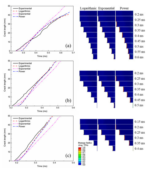 The propagation contours of cohesive element during the dynamic tests are simulated and compared in right side of Figure 4. The total cracking time decreases with the increase of crack-propagation velocity. Due to the approximate plane stress state of the side and the approximate plane strain state of the middle of the specimen, the crack tip is concave in x–z plane and the crack is always initiated firstly at the middle section [35]. To be consistent and comparable with the experiment, the numerical predicted crack-propagation length is counted by erosion of cohesive element along the edges. The predicted cohesive-zone length (length of red-color zone) of power model is obviously larger than that of logarithmic and exponential models which will be further discussed in Section 5.3.