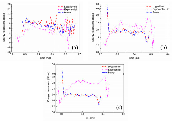 The energy release rate curves of logarithmic model and power model keep oscillation during the crack propagation. The energy release rate of logarithmic model is a little higher than that of power model after 0.45 ms in the 108 m/s condition, which means that the crack propagation speed of logarithmic model is lower than that of power model as can be seen in Figure 4a. The first point of the power model in 175 and 253 m/s condition is extremely high because the first point of da is very small, which should be neglected.
