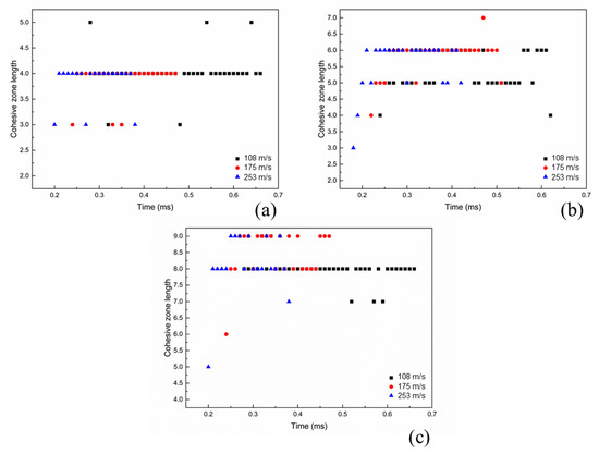 where is the number of damaged cohesive elements and is the size of the cohesive elements which is 0.2 mm in this simulation. The cohesive zone lengths of three models in all conditions are counted and shown in Figure 6 and the is expressed as units of the Y-axis. According to [11], the cohesive zone length in an infinite body can be expressed by the function of strength and fracture toughness: