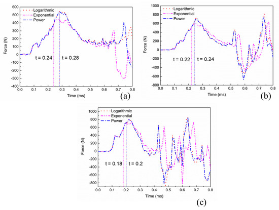 The abscissa of vertical lines in Figure 7 means the initial time of the crack. In the typical loading force-time curves of quasi-static, the delamination begins at the peak force. While in dynamic loading condition, the time of delamination initiation is earlier than that of the peak force except the logarithmic and power models in 108 m/s condition. This may be due to the inertial effect under dynamic loading condition. Additionally, in dynamic loading conditions, the peak forces are almost 10 times than that in quasi-static loading conditions which is also a typical phenomenon under dynamic loading.