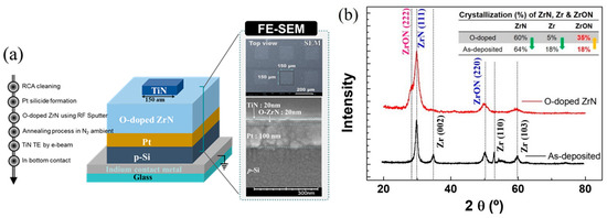 In the era of the fourth industrial revolution research into new non-volatile memory (NVM) devices that can store and process a large amount of information is being actively conducted. Random access memory (RAM) using a resistive switching device (RRAM) has many advantages, such as simple cell structure, long data retention time, excellent scalability, and compatibility with existing CMOS technology, compared to conventional charge-based NVM devices [1,2,3,4]. However, high operating currents can lead to device degradation, so commercialization requires improving the device reliability characteristics, such as durability and maintenance. Various materials are being studied to solve this problem. Recently, a stable resistive switching (RS) characteristic has been reported for various nitride-based materials like ZrN, BN and SiN, all of which feature low operating voltage and fast operation of <100 ns [5,6,7,8,9,10]. According to the reported literature [11], ZrN has attracted much attention as a resistance switching material due to its high thermal conductivity (50 W/mK) and semiconductor phase characteristics, which result in suppression of the random formation of the conductive filament (CF) and improvement of the current overshoot phenomenon of the RRAM. The Kumar Group recently reported an improvement of resistive switching (RS) characteristics, such as the reduced current variation, for ZrN-based RRAM results [12]. However, it is still necessary to lower the high driving current (more than ~10 mA) and the high forming voltage of the ZrN-based RRAM device because it is the cause of the decrease in reliability.