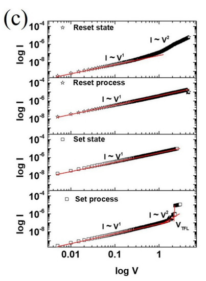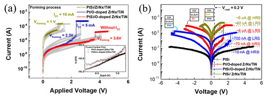 To further study the conduction properties for PtSi/O doped ZrN/TiN samples, we investigated the fitted I–V curve by using various models such as Ohmic conduction, Fowler–Nordheim tunneling, Schottky emission, direct tunneling, P–F emission, and SCLC, respectively [17,18]. As a result, as shown in the inset of Figure 2a, before the forming process, the RS curve of a pristine device was matched with P–F emission model with ln (I/V) vs. sqrt (V). After the forming process, as shown in Figure 2b, the RS curves at both HRS and LRS were consistent with SCLC model of I~V1 at voltages from 0 V to +1.5 V (ohmic behavior), and I~V2 over +2 V (Child’s Law), respectively. The resistance state then shifted from HRS to LRS at the trap-filled limit voltage (VTFL) of +2.2 V during the set process. In short, in the case of pristine cells, the O-doped ZrN film has a high resistance, in the inset of Figure 2a, and the fitting results were well consistent with P–F emission. On the other hand, after a forming process, the results of SCLC fitting at both HRS and LRS showed that many traps were created during the forming process and could be distributed uniformly under the conduction band. Therefore, the generation and erasing of nitrogen (or oxygen) vacancies can contribute to RS phenomena from high resistance to low resistance, and from low resistance to high resistance, via charge trapping/de-trapping process. Noth that the P–F emission and SCLC models are as one of the bulk-limited conduction mechanisms, which depends on charge trapping and de-trapping in trap sites of the film [19,20,21,22,23].