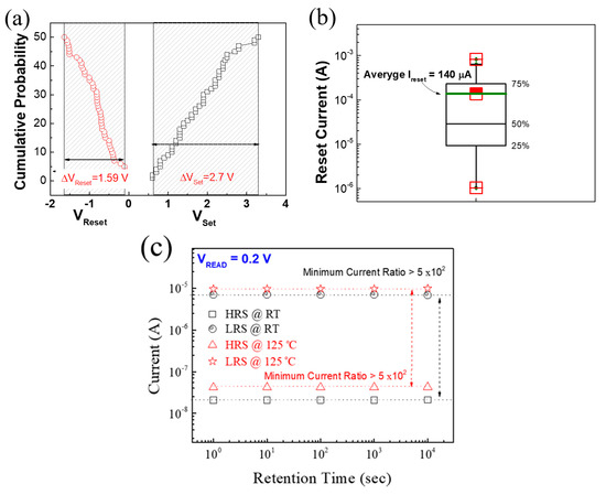 Finally, to study the reliability of proposed RRAM cell, the retention time at the LRS and HRS were investigated by examining the data storage capacity of the proposed cell, in Figure 3c. In this result, it is revealed that the CR of about 5 × 102 between both the HRS and the LRS stably remains without major changes for ~104 s at 25 °C. In addition, to evaluate the thermal stability of the proposed cell, we conducted for the same time at high temperature (125 °C). As a result, when increasing a temperature, the current value slightly increased at both states, compared to room temperature (RT), while a CR of about 5 × 102 was maintained up to 104 s.