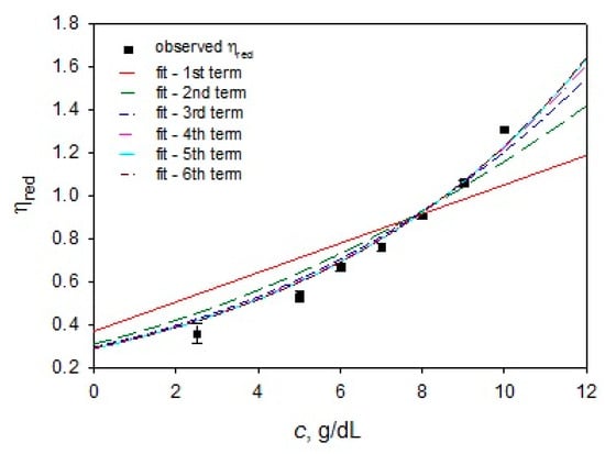 Figure 1 shows a Huggin’s plot of reduced specific viscosity versus concentration. Nonlinear regression by Equation (7) was found to converge by the sixth term ( = 0.292 ± 0.031, = 0.500 ± 0.101,). Potentially due to differences in fractional polydispersity [17] or systematic fitting errors [16], a wide range of literature values have been reported for and combinations [18]. For this reason, experimental intrinsic viscosity determinations were compared to estimations made with the Mark–Houwink equation: