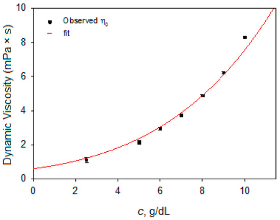 Dynamic viscosity as a function of spin-coating solution concentration. The fit line was determined by combining Equation (5) with Equation (7) (truncated at the third term) and solving for η0, with R2 = 0.973 and standard error ± 0.34.