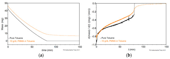 (a): TGA thermogram showing isothermal evaporation of pure toluene and a 10 g/dL PMMA–toluene solution under N2 purge. Both solutions were monitored until dry. The residue mass in the 10 g/dL PMMA curve represents the dried polymer. (b): Derivative TGA thermogram of solvent and polymer solution at ambient temperature with respect to polymer mass fraction.