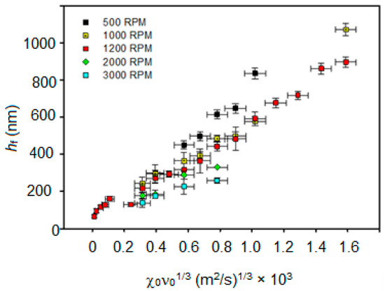 Scatter plot of spin speed contribution to film thickness. Scatter plot of final film height by spin speed scaled by Equations (1)–(4). Error bars are the standard deviation of at least 3 measurements per point.