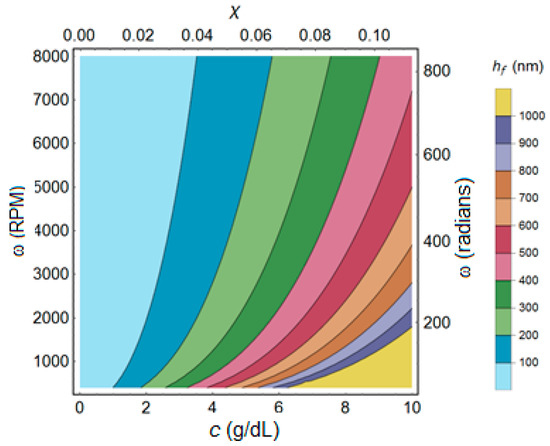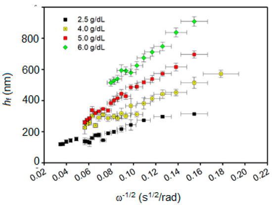 Owing to the high molecular weight of the polymer, film thickness is largely dictated by spin-coating parameters related to the transport of the solution over the substrate. The reported thicknesses are averages since the films have measurable roughness that will be addressed in detail in a forthcoming manuscript. The primary and secondary factors with the largest impact on film thickness are initial solution concentration and spin speed [12,13,30]. Figure 6 shows the final film height as a function of combined concentration and viscosity variables from Equation (4). At a given spin speed, the final film thickness increases linearly as a function of the fluid properties given by . Figure 7 plots final film height against spin speed, as given in Equation (4). At a given initial concentration, the final film thickness also increases linearly with the inverse square root of spin speed. Comparisons of slopes in Figure 6 and Figure 7 imply that changes in solution concentration have a greater impact on film thickness than changes in angular velocity.