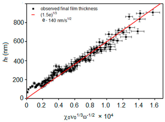 Figure 8 combines the two previous plots, as given in Equation (4), to determine the static evaporation rate, e. The slope of the fit line is (3e/2)1/3, giving e = 140 nm/s½. The evaporation rate under spinning conditions is then found to be nm/s½, which is somewhat less than nm/s½ reported in similar studies [3,25]. Possible reasons for this difference may be related to the temperature or the vapor phase composition. As would be expected, the spinning significantly increases the evaporation rate compared to the static evaporation found from the open pan (195 to 570 nm/s).