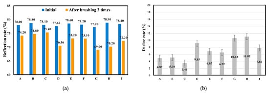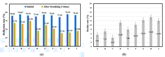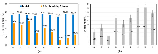 As shown in Figure 2, after brushing two times, the highest decline rate for reflection occurred in group H (11.02%), from 78.90% to 70.20%, and the lowest decline rate for reflection occurred in group C (3.46%), from 78.10% to 75.40%. In addition, the average decline rate for reflection for groups A–C (silicone–acrylic paint) was 4.47%, and those for groups D–F (styrene–acrylic paint) and groups G–I (pure acrylic paint) were 7.51% and 9.81%, respectively.