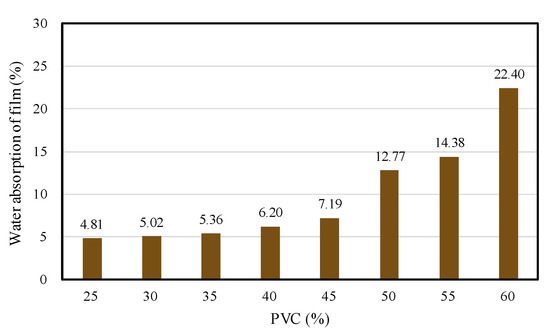Figure 6 shows the effects of different PVCs on the water absorption of the paint’s film. Seven groups of samples were tested. The pore was the main means of water absorption by the film when the surface energy of the film was certain. The porosity was the main factor affecting the water absorption of the film, and an increase in the porosity led to an increase in the water absorption of the film. Figure 6 shows that the water absorption of the film increased with an increase in PVC. When the PVC reached 45%, the curve had an inflection point, and then, the water absorption increased sharply with an increase in PVC.