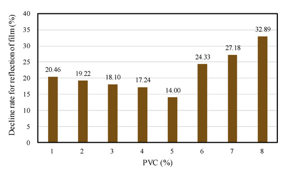 Figure 7 shows the effects of different PVCs on the stain resistance of the paint’s film. The decreases in the values of reflectivity of seven groups of different PVC samples were tested to characterize the stain resistance of the film. This is because the reflectivity value of the paint’s film had been shown to be closely related to its stain resistance. The higher the reflectivity value of the film was, the worse the stain resistance rate of the film was, and vice versa. As can be observed in Figure 7, the decline rate for the reflection value of the film decreased gradually with an increase in PVC. When the PVC increased to about 45%, the decline rate for the reflection value decreased to the lowest point and then increased sharply with an increase in PVC. At the beginning, the stain resistance of the film gradually improved with an increase in PVC; it began to decrease sharply when the PVC exceeded a certain point.