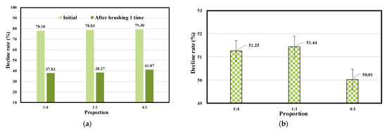Design 1: (a) the change in the reflection rate and (b) the decline rate (after brushing 4 times).