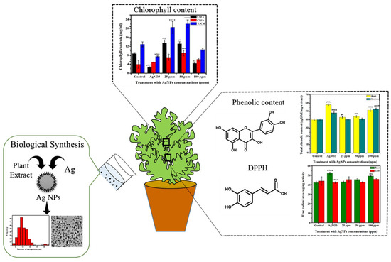The overall synthesis process of Ag NPs and their impact on the chlorophyll content, phenolic content, and 2,2-diphenyl-1-picrylhydrazyl (DPPH) in the lettuce plant are shown schematically in Figure 1.