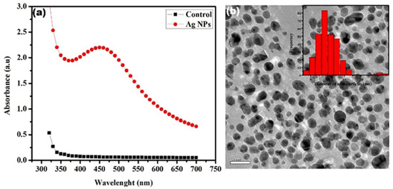 (a) Ultraviolet (UV)-visible spectra of Ag NPs (red) and AgNO3 solution without the plant extract (black). (b) TEM image of Ag NPs (the insets show a histogram representing the Ag NPs size distribution.