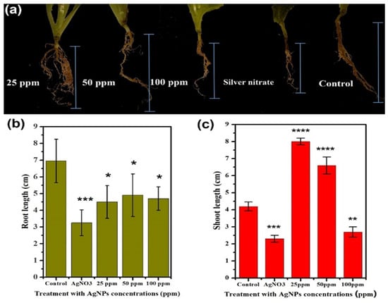Effect of different concentrations of Ag NPs and AgNO3 (1 M) on root morphology (a) root (b) and shoot (c) length of the lettuce plant. The symbol of *, **, ***, **** show that datasets are significantly different from one another.