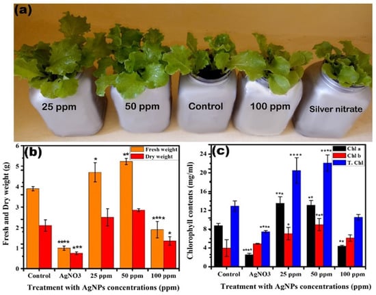 (a) Morphological and physiological study of different concentrations of Ag NPs and 1 M AgNO3 on the lettuce plant. (b) Fresh and dry weight of lettuce upon exposure to different concentrations of Ag NPs and 1 M AgNO3. (c) Chlorophyll a, chlorophyll b, and total chlorophyll of lettuce subjected to 25, 50, 100 ppm Ag NPs and 1 M AgNO3. The symbol of *, **, ***, **** show that datasets are significantly different from one another.