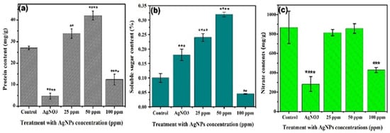 Effect of different concentrations of Ag NPs and AgNO3 (a) protein content, (b) soluble sugar content, and (c) nitrate content of lettuce plant. The symbol of **, ***, **** show that datasets are significantly different from one another.