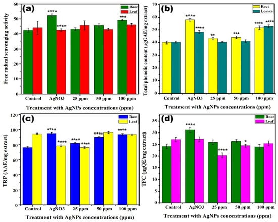 To further explore the impact of external metallic contents on plant growth, we analysed the effect of Ag NPs on the total phenolic contents (TPC), scavenging activity, total flavonoid contents (TFC), and total reducing power (TRP), as shown in Figure 7. The scavenging activity was significantly increased in the roots by 10% and 7% in response to silver nitrate and 100 ppm Ag NPs as compared to the control. However, no significant change in the scavenging activity AgNO3 treatment was observed in response to all the concentrations, clearly indicating that Ag NPs at a higher concentration induced the toxicity in plants leaf, as shown in Figure 7a. The TPC contents in the root were increased by 18% and 11%, while in leaves it increased up to 8% and 12% in response to silver nitrate and 100 ppm Ag NPs compared to the control. While, the level of TPC was increased at 25 and 50 ppm concentration but was not very significant (Figure 7b). In the case of 25 and 50 ppm concentration of NPs, there was no significant difference in the decreased or increased TPC as compared to the control. A 19% increase in the TRP of roots was observed for silver nitrate and 14% was observed in the case of 100 ppm of Ag NPs compared to the control. However, the 25 and 50 ppm concentration did not show a significant impact compared to AgNO3 and 100 ppm Ag NPs, as shown in Figure 7c. The TRP of leaves reduced by 18% and 20% upon feeding silver nitrate and 25 ppm of Ag NPs, however, no significant difference is observed for a higher concentration of Ag NPs (Figure 7c). Moreover, TFC results were significant in both roots and leaves in response to silver nitrate and 25, 50, and 100 ppm of Ag NPs with regards to the control, as shown in Figure 7d.