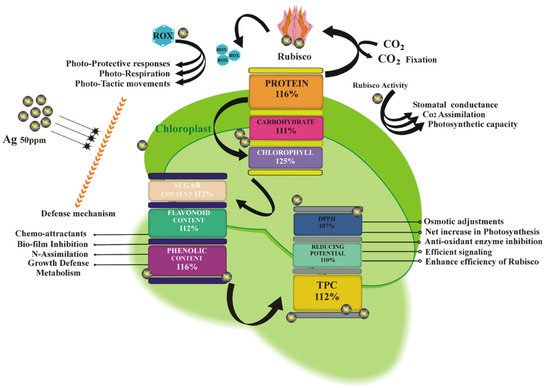 Addressing the matter of the optimized Ag NPs 50 ppm dosage on lettuce had provided a significantly enhanced level of proteins, carbohydrates, and chlorophyll contents, where the protein content has been increased up to 16%, causing an elevation in the chlorophyll content to 25% which had essentially trigged and boosted the production of Rubisco. The pumped-up rubisco not only initiated the rubisco generated cascade but also provides reactive oxygen species (ROS) generation for photo-protection, photorespiration, photo-tactics, and defensive mechanisms, as shown in Figure 8.