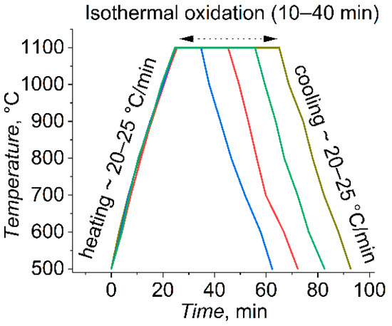 High-temperature oxidation of the samples was performed using an atmospheric furnace (ATS 3210, Applied Test Systems Inc., Butler, PA, USA). All tests were started from 500 °C, followed by a temperature ramp up to 1100 °C with a heating rate of ~20–25 °C/min. Next, the samples were isothermally oxidized at 1100 °C for 10, 20, 30 and 40 min. After oxidation, the furnace was opened, and the samples were naturally cooled to room temperature. The temperature profiles are shown in Figure 1.