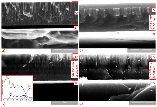 The cross-section SEM images of the as-deposited coatings on Si substrate: (a) Cr coating; (b) CrN/Cr-50 coating; (c) CrN/Cr-250 coating; (d) CrN/Cr-500 coating. Elemental depth distribution in the CrN/Cr-250 sample is shown.