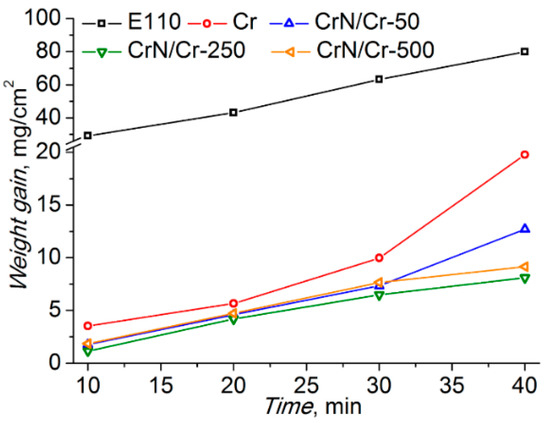 The uncoated E110 alloy has the highest weight gain, which is equal to ~24 mg/cm2 (10 min) and increases up to ~80 mg/cm2 (40 min). The coated samples have significantly lower weight gain, but the coating type affects the oxidation kinetics. Among them, the Cr sample has the highest weight gain in each oxidation test, which strong rises to ~10–20 mg/cm2 for 30–40 min oxidation. The samples with multilayer coatings have a comparable weight gains up to 30 min oxidation. Only for the CrN/Cr-50 sample was an accelerated oxidation observed after 30 min oxidation. The lowest weight gain belongs to the CrN/Cr-250 sample (1–9 mg/cm2 depending on oxidation time).