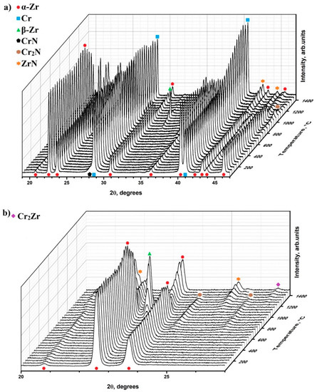 No phase changes occur in the sample with the multilayer CrN/Cr-250 coating only up to 600 °C (Figure 10a). The growth of Cr2N phase begins at 650 °C, while the intensity of CrN phase decreases. The temperature rise up to 900 °C is accompanied by α → β phase transition of Zr. There is no complete α → β transformation with increasing temperature, which is due to the partial decomposition of CrN to Cr2N and the stabilization of the α-Zr phase by nitrogen (α-Zr(N) phase). The simultaneous decrease in the reflections of Cr2N phase and the appearance of the reflections of the ZrN phase are observed at 1000 °C. This fact indicates the formation of the ZrN phase caused by the reaction of zirconium with nitrogen formed during the decomposition of the Cr2N phase. The complete decomposition of the Cr2N phase occurs at 1200–1250 °C. It should be noted that the intermetallic Cr2Zr phase was observed only at the temperatures above 1350 °C (Figure 10b).