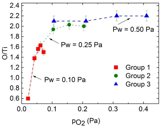 The deposition of the films was performed at three different working pressures (Pw), 0.1, 0.25, and 0.5 Pa. For each Pw, the oxygen/argon ratio was varied by changing the O2 gas flow from ~20 to ~80%. Consequently, the oxygen partial pressure (pO2) during deposition ranged from 0.02 to 0.41 Pa. The O/Ti ratio for the different films obtained by RBS are shown in Figure 1. RBS profiles (not shown) indicated that the composition is uniform through the thickness of the films. It was found that the samples could be divided into three main groups according to their stoichiometry. In Figure 1, it is shown that the group 1 (G1) samples have an O/Ti ratio lower than 2 (0.6 ≤ O/Ti ≤ 1.6), samples in group 2 (G2) exhibit an O/Ti close to 2 (1.9 ≤ O/Ti ≤ 2.0), and finally, samples belonging to group 3 (G3) have an O/Ti ratio higher than 2 (O/Ti ≥ 2.1). This classification of the deposited films in three different groups is further supported by the differences in crystallinity of the samples, as will be shown by XRD and Raman results in Section 3.2. G1 samples are obtained at the lowest working pressure (0.1 Pa) or at the intermediate pressure (0.25 Pa) and low oxygen partial pressure (<0.1 Pa). Stoichiometric TiO2 samples in G2 can be obtained at 0.25 Pa working pressure provided that the pO2 is over a threshold value of~> 0.1 Pa. Finally, over stoichiometric (G3) films are obtained for the working pressure of 0.5 Pa in the entire oxygen partial pressure range analyzed.