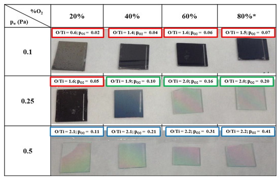 Summary table of deposited samples with varying % of Ar/O2 gas flow, and Pw including: picture of each sample deposited on glass, pO2 during deposition and elemental at.% (O/Ti ratio) obtained by RBS. The code color indicates the samples belonging to group 1 (red), 2 (green), and 3 (blue). * For the lower working pressure (0.1 Pa), it was not possible to perform the deposition process with more than 70% of oxygen gas flow.