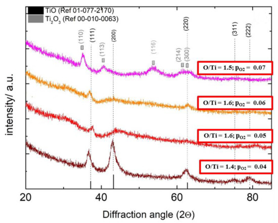 In Figure 5, the diffractograms for the samples belonging to G1 are plotted. No peaks related to any TiO2 crystalline phases are observed. For samples with pO2 of 0.04, 0.05, and 0.06 Pa, despite the different stoichiometries, the peaks can be attributed to TiO (ICC card 01-077-2170) with a cubic structure, (rock-salt space group 225, Fm-3m) in all the samples. Reference crystal peaks at 2θ = 36.60°, 42.87°, 62.38°, and 75.01° are associated with the crystal planes (111), (200), (220), and (311), respectively. For the sample with the strongest diffraction peaks in G1 (pO2 = 0.04), the diffraction peaks appear at slightly smaller diffraction angles (between 0.2 and 0.5°), corresponding to a larger lattice constant of the rocksalt-type sample than in the reference data set of TiO. The sample deposited at pO2 = 0.07 (O/Ti ratio of 1.5) shows diffraction peaks at 2θ = 35.00°, 40.66° and 54.21°. These peaks can be attributed to Ti2O3 (ICC card 00-010-0063), space group 167, R-3c, corresponding to the crystal planes (110), (113), and (116), respectively. Around 2θ = 62° a broad peak is observed which can be related to the contribution of crystal planes (214) and (300), related to peaks at 61.34° and 62.58° in the reference card (see Table 1). In general, the peaks are very broad, except for the one at 2θ = 35.00°. Parker et al [19] reported on the formation of the Ti2O3 layer by bombardment with Kr ions on TiO2. A high dose ion impact led to preferential oxygen sputtering and/or internal precipitation of oxygen. Ion energy is higher in cathodic arc vacuum deposition, so, in the current work, the Ti2O3 phase could be formed at low working pressures (where high ion energy of the ions is expected) and with a high oxygen partial pressure.
