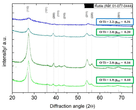 A completely different scenario is observed for the three samples belonging to group 2 (Figure 6 and Table 2). The diffractograms of samples belonging to this group showed a pattern corresponding to rutile TiO2 with tetragonal structure (space group 136, P42-mnm). The main rutile peak (110) is observed at 2θ = 27.39°, 27.38° and 27.3° for samples with pO2 of 0.10, 0.16, and 0.20 Pa, respectively. Hence these peaks are slightly shifted to higher angles with respect to the reference pattern (2θ = 27.29°) for this crystal plane (110). The other main peaks are observed at 2θ~54° and 56°, related to crystal planes (211) and (220). These three main peaks have been selected to calculate the lattice parameter (a and c) and the crystallite size. Other minor peaks confirming the rutile phase observed at 2θ~38.97, 40.97, 43.80, and 68.56° are associated to the crystal planes (200), (111), (210), and (301), respectively, according to the reference card.