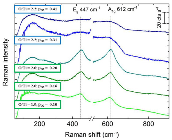 The Raman spectra of the films grown at a working pressure of 0.25 Pa with an oxygen partial pressure of 0.10 to 0.20 Pa (G2 samples) are dominated by strong lines at 450 ± 2 cm−1 and 608 ± 3 cm−1 (Figure 8). These lines point to the presence of nano-crystalline rutile-type TiO2, whose strongest Raman lines are the Eg line at 447 cm−1 and the A1g line at 612 cm−1 [21]. The line positions found for the films grown in this work are close to the literature values, shifted by +3 (Eg) and by −4 cm−1 (A1g), respectively. The observed downshift of the A1g line might be caused by the small size of the rutile-type TiO2 crystals grown here. According to Swamy et al. a shift of −4 cm−1 would indicate a crystallite size of 10 nm [22]. This value is in very good agreement with that of 6 nm obtained by XRD for these samples (Table 2).