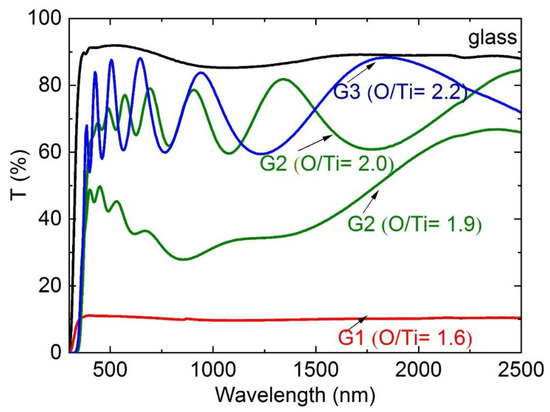 Spectral transmittance and ellipsometry measurements were performed to correlate the changes observed in the stoichiometry and crystallinity of the films with their optical properties. Figure 9 shows the transmittance spectra of the films deposited on glass substrates for samples of the three different groups. Only stoichiometric samples or samples with O/Ti ≥ 2 exhibit a high transmittance in the visible and near IR region, in agreement with the images of the samples depicted in Figure 2. The transmission spectrum of G1 (O/Ti = 1.6) consists of a straight line in the whole UV-Vis-NIR. It is therefore a broad band absorber, presumably based on different color centers from differently charged ions (Ti2+, Ti3+ (Ti+)) and maybe oxygen vacancies.