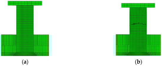 According to the basic model of pressure riveting of riveted lap joints in the second section, we adjusted the pressure riveting angle and direction of the punch in the model. The riveting angle is divided into 1°, 2°, and 3°, and the pressure riveting direction is divided into 0° and 180°. Figure 11 is a finite element model with a riveting angle of 3° in the directions of 0° and 180°. Figure 11a is the model when the pressure riveting angle is 3° in the 0° riveting direction; Figure 11b is the model when the pressure riveting angle is 3° in the 180° riveting direction. For the convenience of the following description, the specified symbol x-y is the abbreviation of the model with the pressure riveting angle of y° in the direction of x°, where x takes values of 0 and 180, and y takes values of 0, 1, 2, and 3. For example, 0-3 represents pressure riveting with the punch deflected by 3° under the direction of 0°; 180-3 represents pressure riveting with the punch deflected by 3° under the direction of 180°.