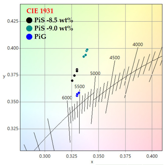 PiS WLED doped with 8.5 and 9 wt.% yttrium aluminum garnet (YAG) phosphors and the PiG WLED CIE coordinate distribution of the covered PiG.