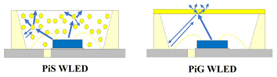Two structural samples were produced and compared in this study. Figure 1 shows the structure of the PiS WLED and the PiG WLED. We used PiG to cover the SMD and further studied its influence on light output, thermal properties, and reliability.