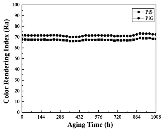 Color rendering index (CRI) drift of PiS WLED and PiG WLED at 350 mA for 1008 h.