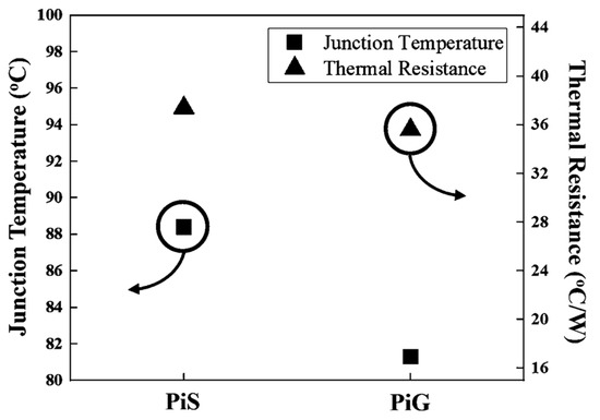 Figure 7 shows the Tj of the PiG WLED and the PiS WLED measured by the forward voltage method at a 350 mA operating current [24]. In accordance with JEDEC (Joint Electron Device Engineering Council) Standard No. 51-1, the Rth of a single semiconductor device was converted [24,25]. The y-axis on the left of Figure 7 is the Tj of the PiS WLED and the PiG WLED, and the y-axis on the right is the Rth of the PiS WLED and the PiG WLED obtained using the Rth formula. The Rth of a single semiconductor device is defined in Equation (1):