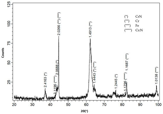 XRD pattern of Cr/CrN coating produced by means of the physical vapor deposition (PVD) method on AISI 1045 steel.