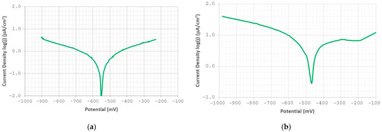 Polarization curves of the tested coatings: (a) Cr/CrN PVD, (b) gas nitrided with subsequent oxidation and impregnation.